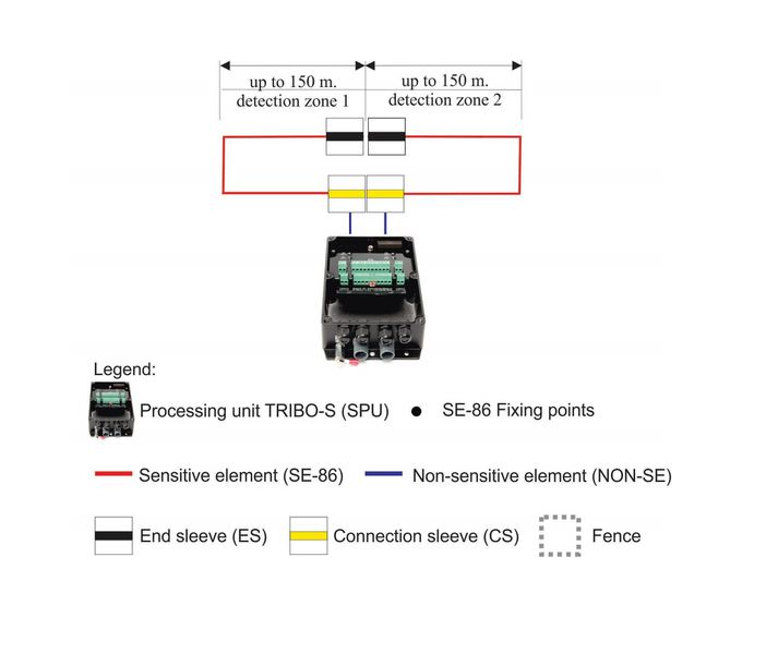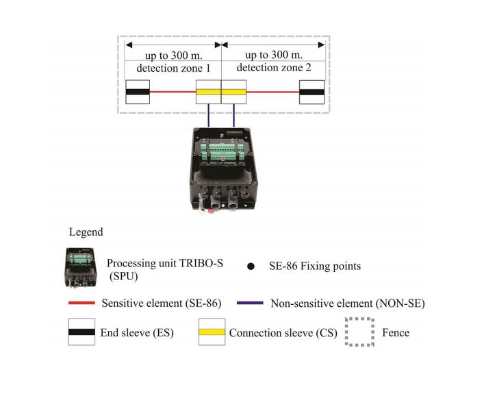 Система охраны периметра Forteza Tribo-S с сенсорным шнуром для защиты всех видов ограждений • 2 зоны обнаружения • Длина шнура <300 м • Класс безопасности IP 55 • Безупречный срок эксплуатации до 8 лет • Возможность установки на все виды заборов.
