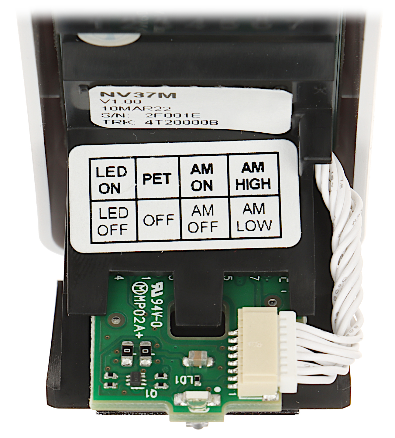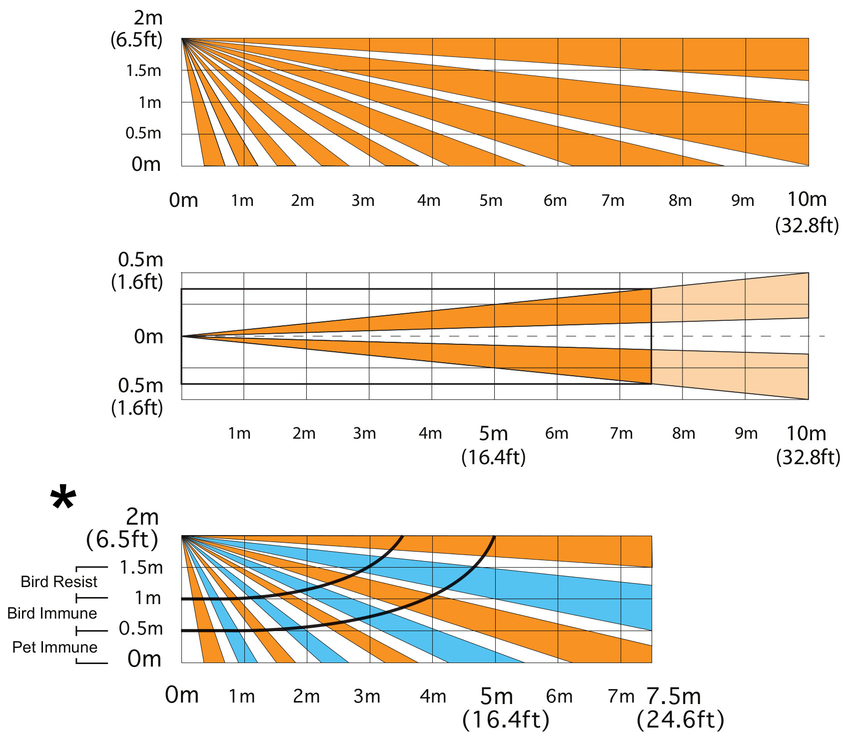 Sensor type: Passive Infra Red (PIR) ; Range: 7.5 x 2 m - PET mode 10 x 2 m - SHARP mode ; Detection angle: ~ 12 ° ; Pet immunity: ≤ 50 cm ≤ 40 kg ;