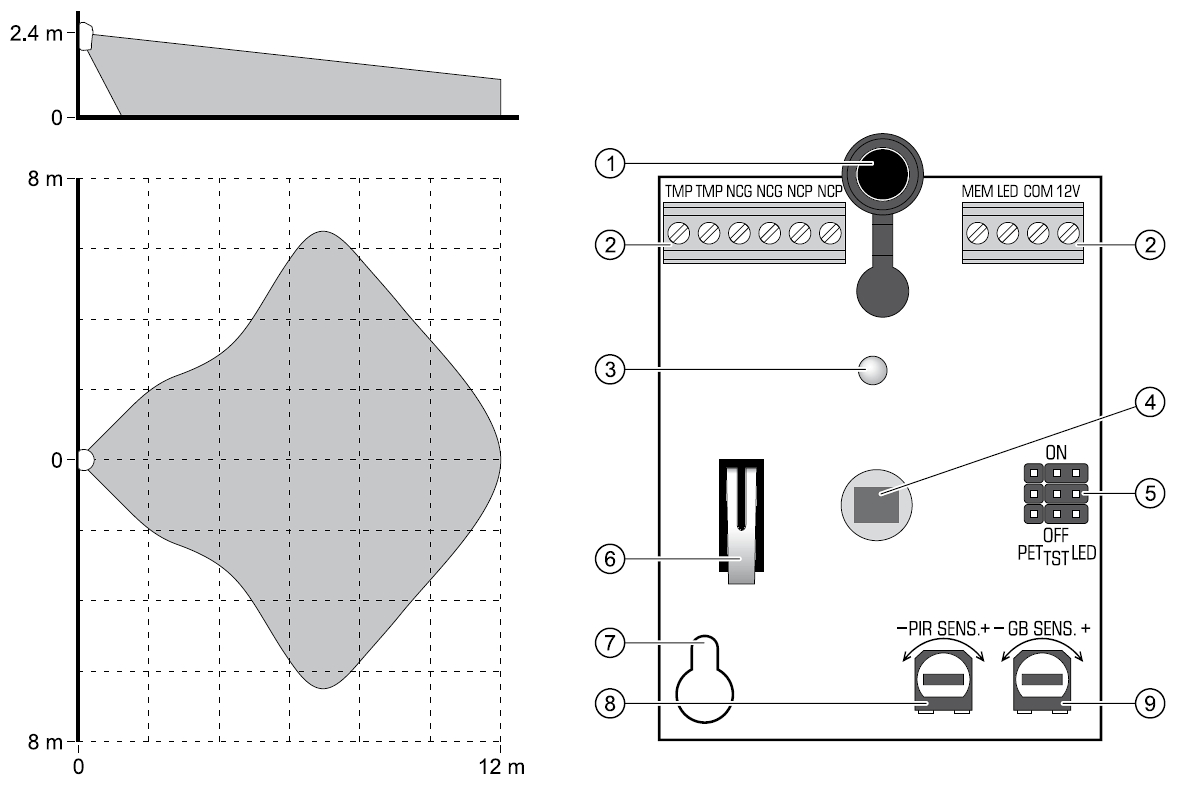 Application: Indoor ; Sensor type: Passive Infra Red (PIR), Glass break detector ; Range: 12 x 13 m - PIR detector, 6 m - Glass break detector ; Pet immunity;