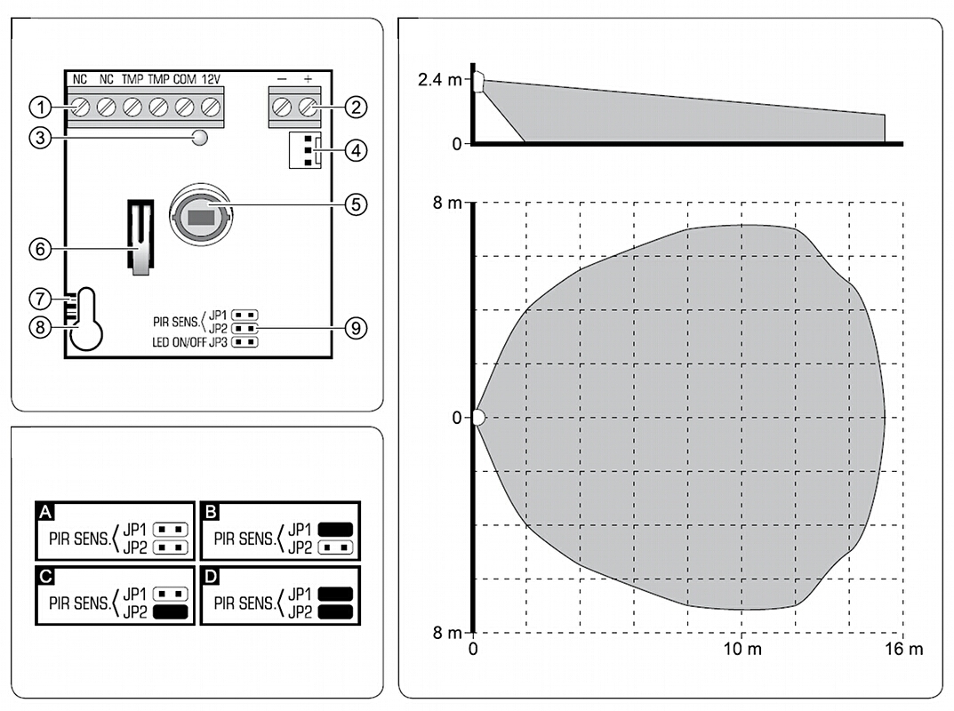 Application: Indoor ; Sensor type: Passive Infra Red (PIR) ; Range: 15 x 14 m ; Prealarm feature;