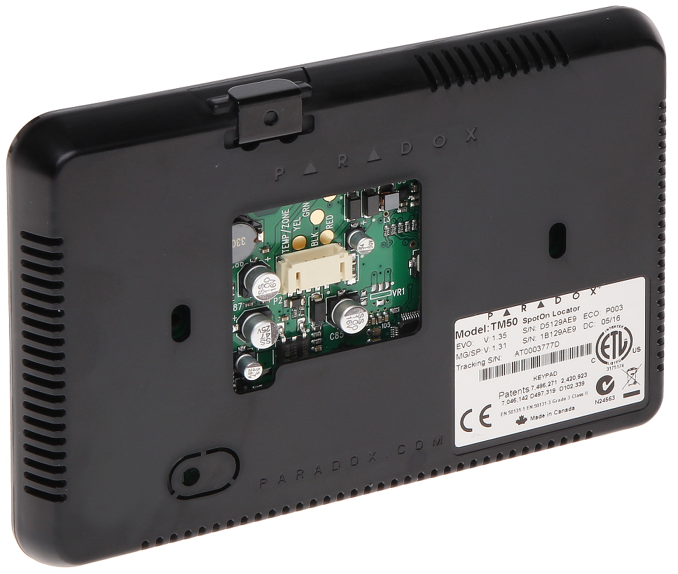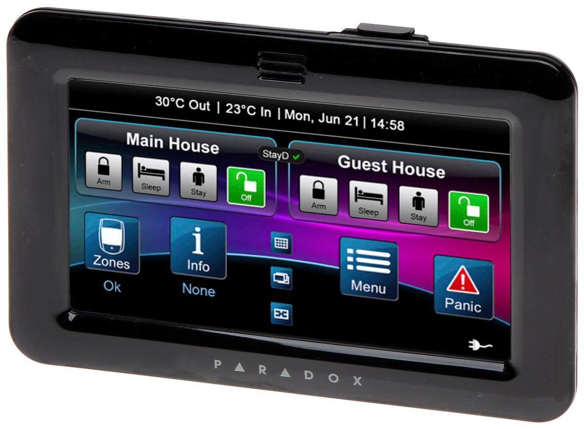 Easily readable LCD with backlight displaying detailed information on system state; Support: PARADOX: SPECTRA SP/MAGELLAN MG V4.72+, EVO V2.16+ ; Main features: 5 " capacitive touch screen - 16 bit / 480 x 272 px, SpotOn Locator - floor plans function, One Screen Monitoring - synaptic table function, Temperature Sensor, The microSD cards support, Digital photo frame mode ; Color: Black ;