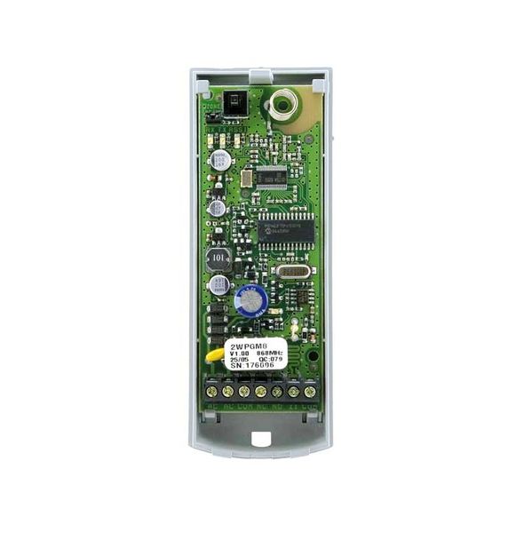 • Встроенный приемопередатчик (433МГц или 868МГц) • Резервный сигнал тревоги (активирует программируемый выход, если потеряна связь между панелью и 2WPGM) • Полностью программируемый релейный выход (5А) • Выключение программируемого выхода по событию или согласно таймеру • Питание от постоянного (5-30В) или переменного (6-16,5В) напряжения • Универсальный вход передатчика (N.O./N.C.) • Дальность действия в типичных жилых условиях: • 35м с MG6160 / MG6130 • 70м с MG5000 / MG5050 / RTX3 • Датчик вскрытия корпуса • Габаритные размеры: 12,4см x 4,5см x 3,3см