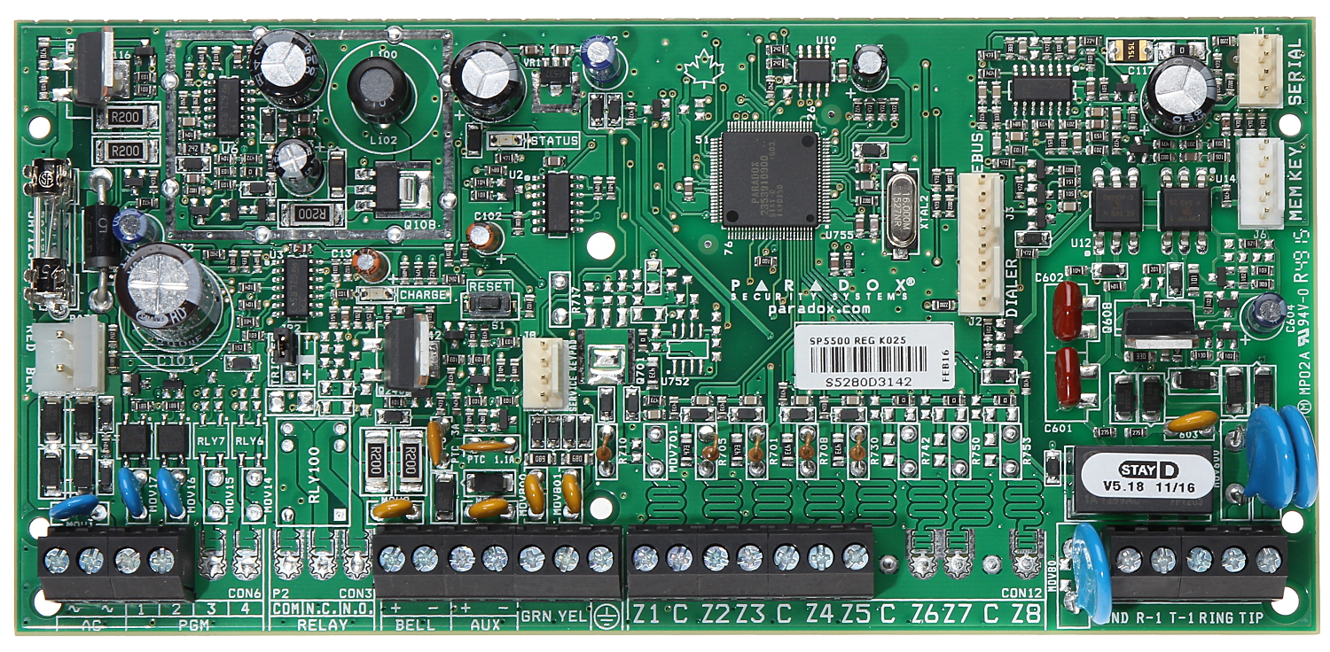 Mainboard inputs: 5 pcs ; Mainboard outputs: 2 pcs - programmable ; Partitions: 2 ; Zones: 4 ; Expansion modules: 24 (3 x ZX8) ; Events memory: 256 ; Timers: 16 ;