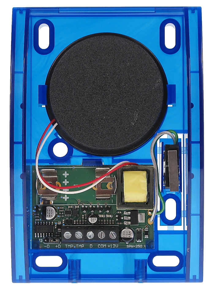 Sound pressure level: 120 dB ; Power supply: 12 V DC ; Current consumption: max. 90 mA ; Color: Blue ; Operation temp: -10 °C ... 55 °C ;