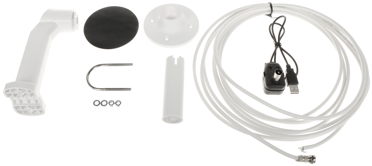 • Antenna cable + F plug, Antenna separator + IEC plug, Power supply cable + USB-A plug, base for mounting the antenna, Mast mounting diameter, U-Bolt - included