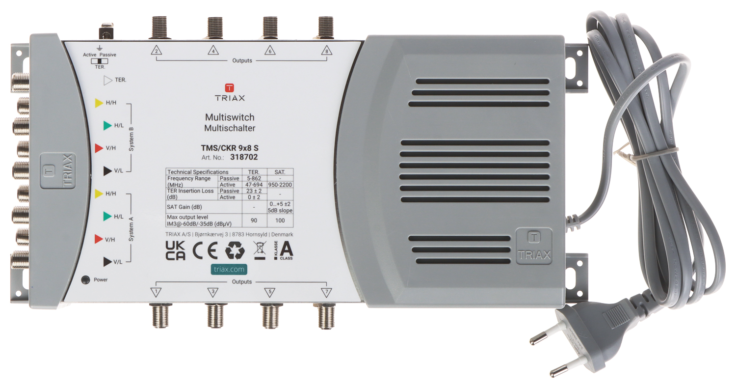 | Return loss: | TV input : > 10 dB SAT input : > 10 dB Outputs : > 10 dB |